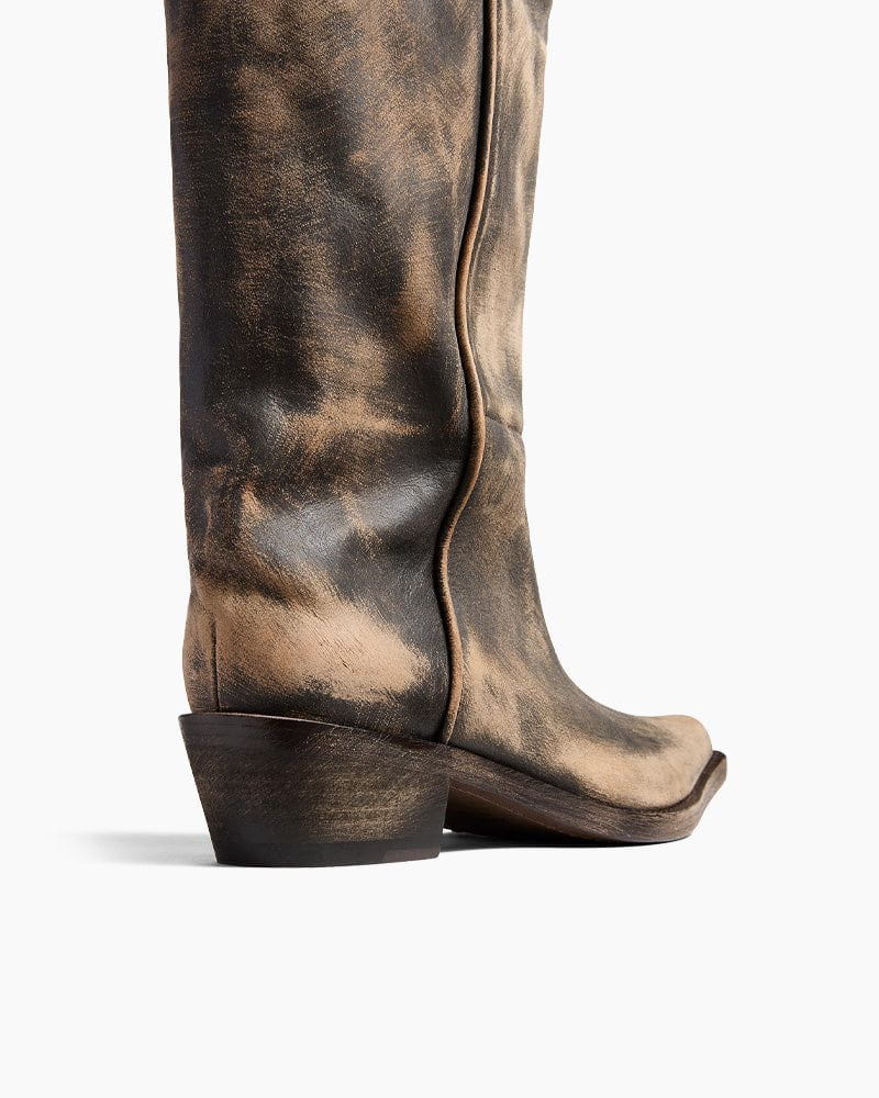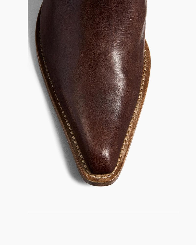 A refined take on the classic Western silhouette. Crafted from Microfiber Leather, this boot blends rustic charm with sharp sophistication. Its snip-toe shape, angled shaft, and patinated leather heel evoke timeless craftsmanship and understated confidence.
